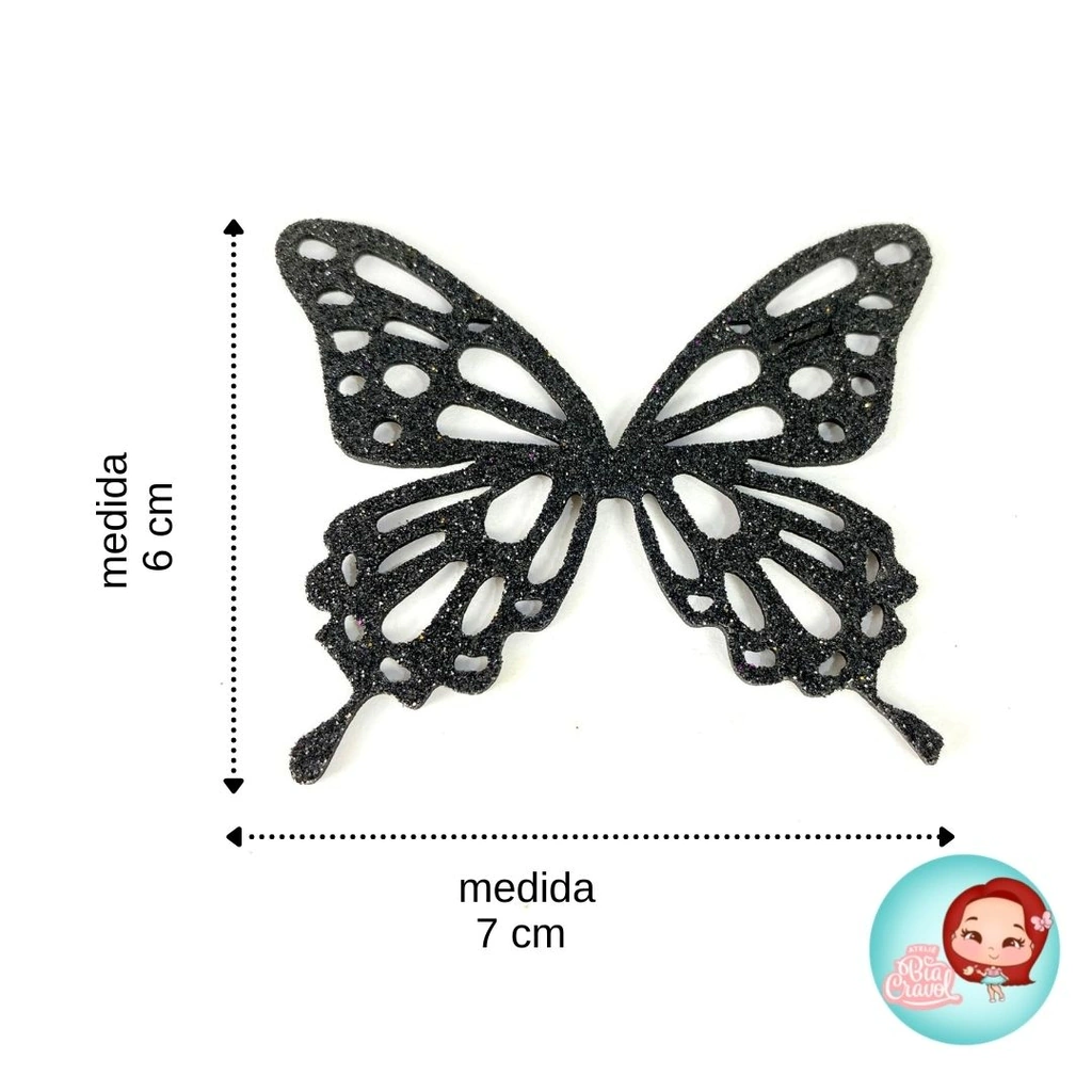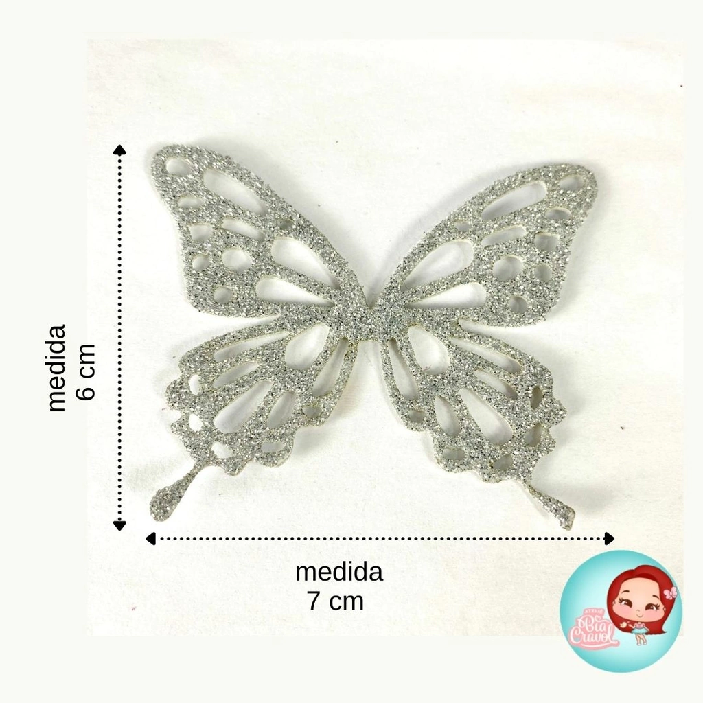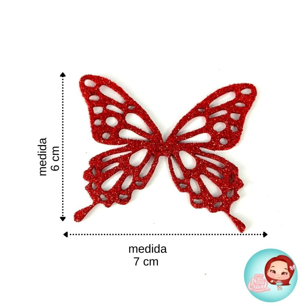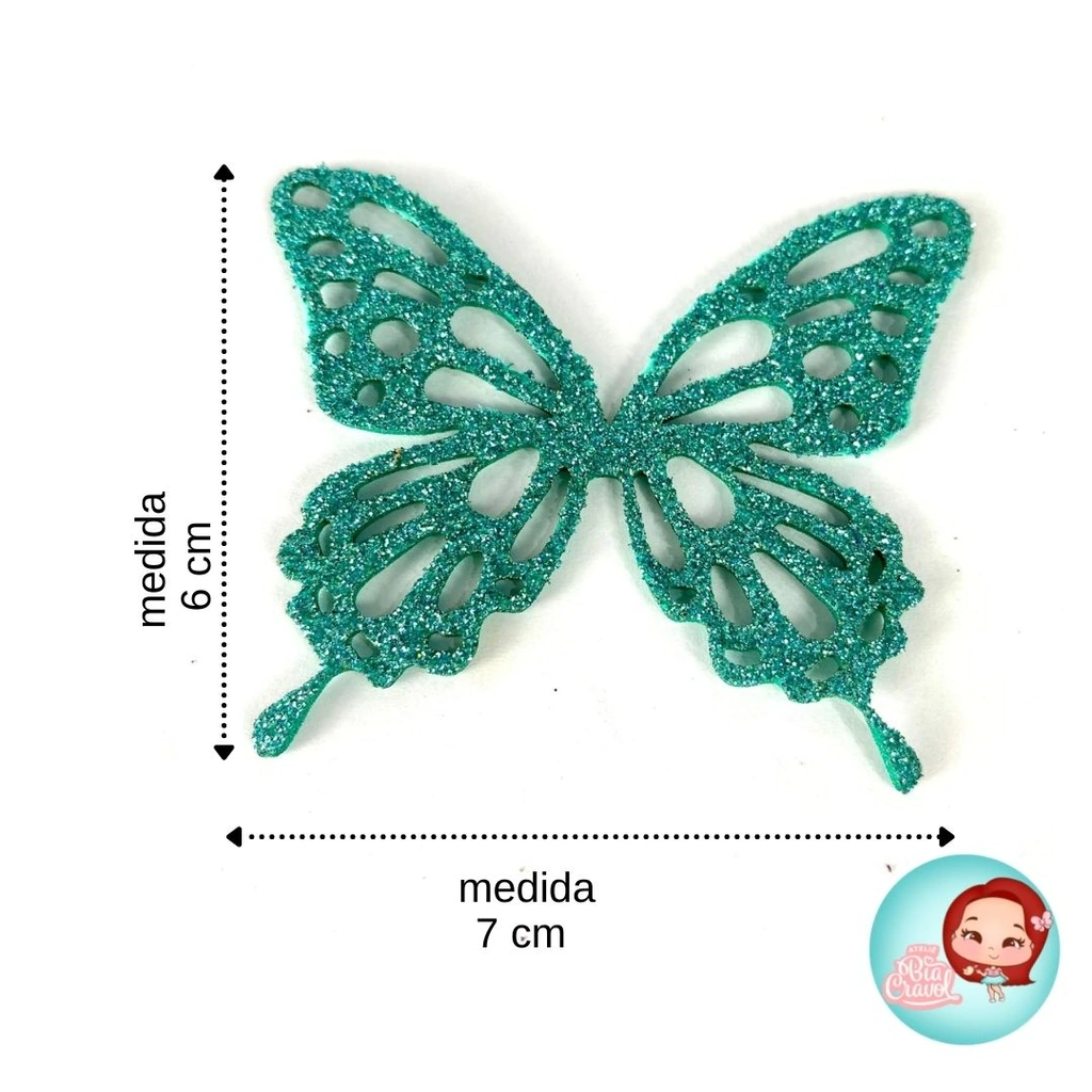 Essas lindas borboletas são feitas em EVA com Glitter em diversas cores e tamanhos para você deixar a sua peça linda.